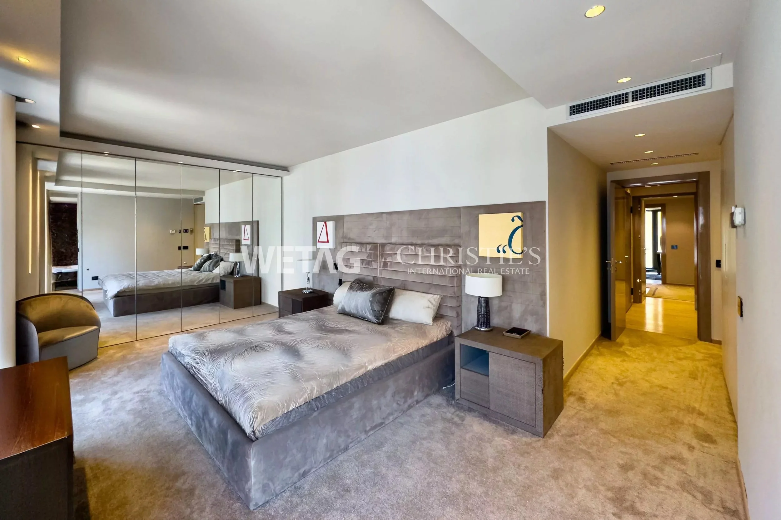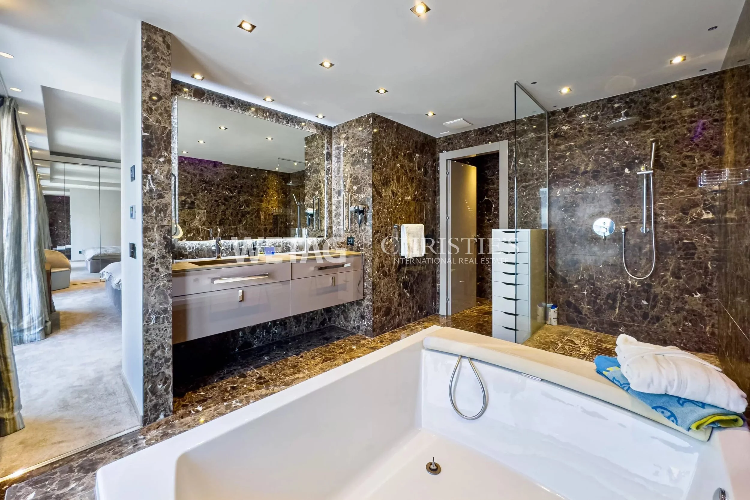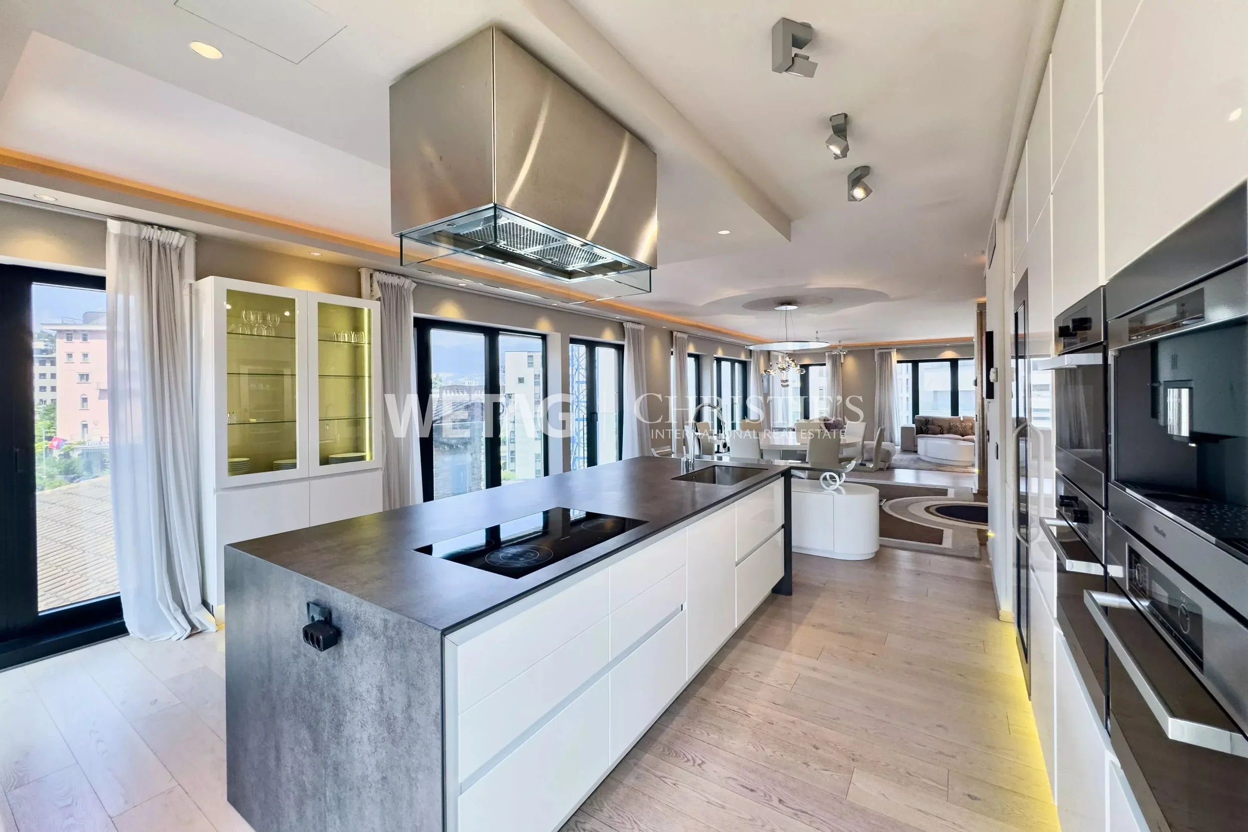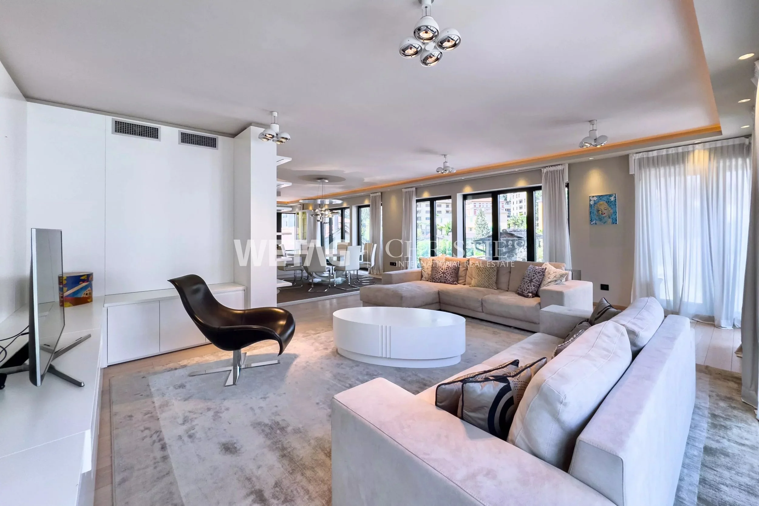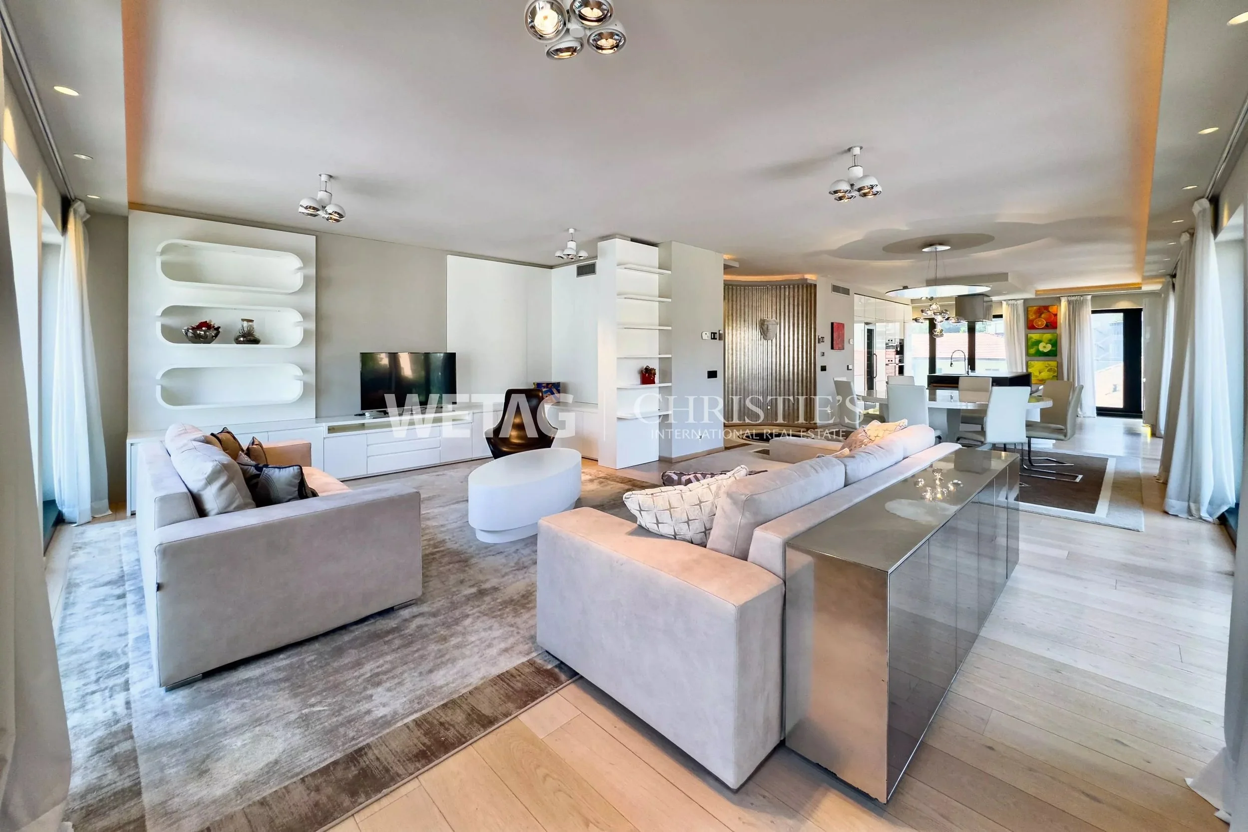 Bright, light-filled rooms with an open floor plan create a generous sense of space. The living and dining areas flow seamlessly into one another, while the modern kitchen is equipped with high-quality appliances. Refined marble bathrooms, elegant bedrooms with built-in wardrobes, and stylish color schemes lend the interior both a prestigious and welcoming atmosphere. Upon request, the tasteful furnishings can be taken over.
