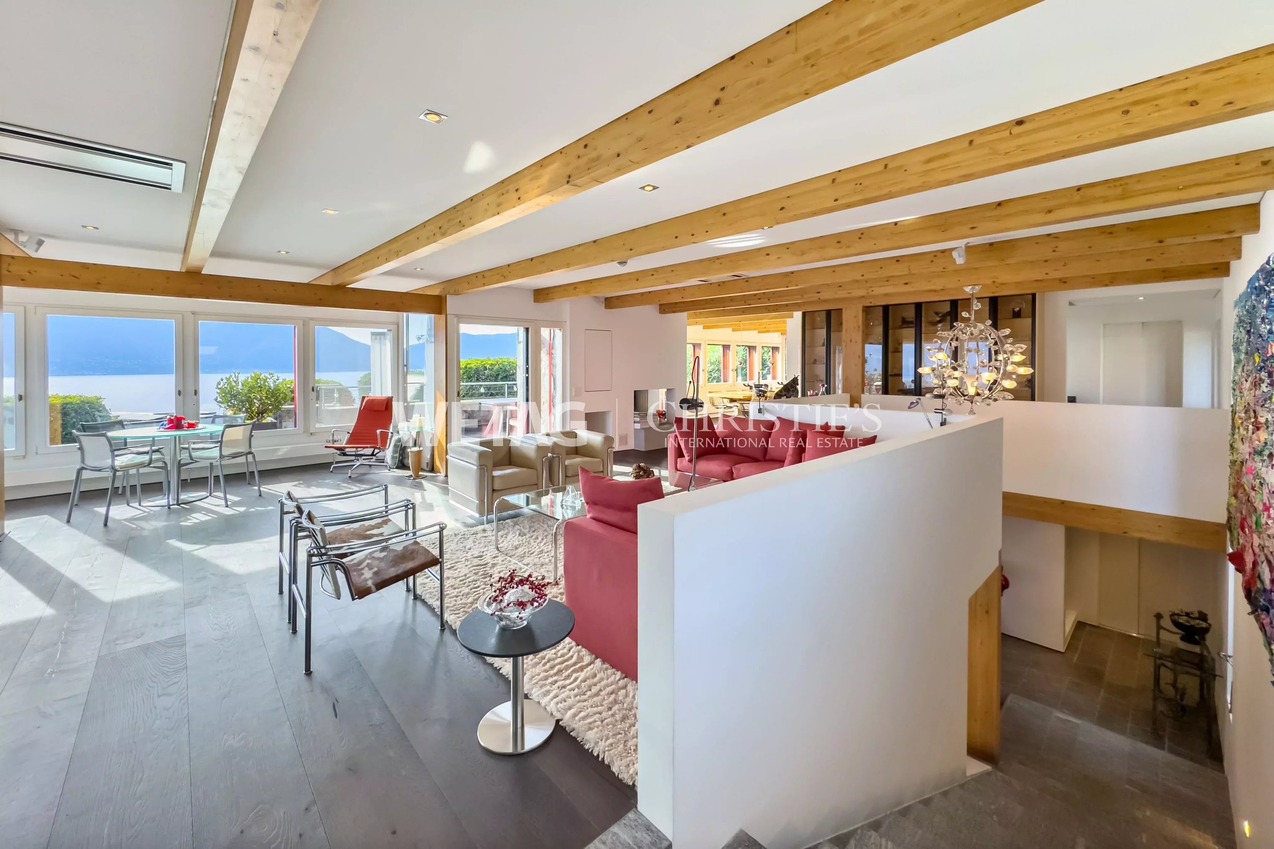 Im Inneren öffnet sich eine lichtdurchflutete Wohnwelt mit hohen Räumen, sichtbaren Holzbalken und grossen Fensterfronten, die den Blick immer wieder auf See und Berge lenken. Offene Wohnzonen, stilvolle Designelemente und eine hochwertige Küche schaffen viel Platz für Familie und Gäste. Schiebetüren verbinden Innen und Aussen nahtlos: Geniessen Sie sonnige Stunden auf den Terrassen oder entspannte Momente am Pool, wo Ruhe und Privatsphäre spürbar sind.